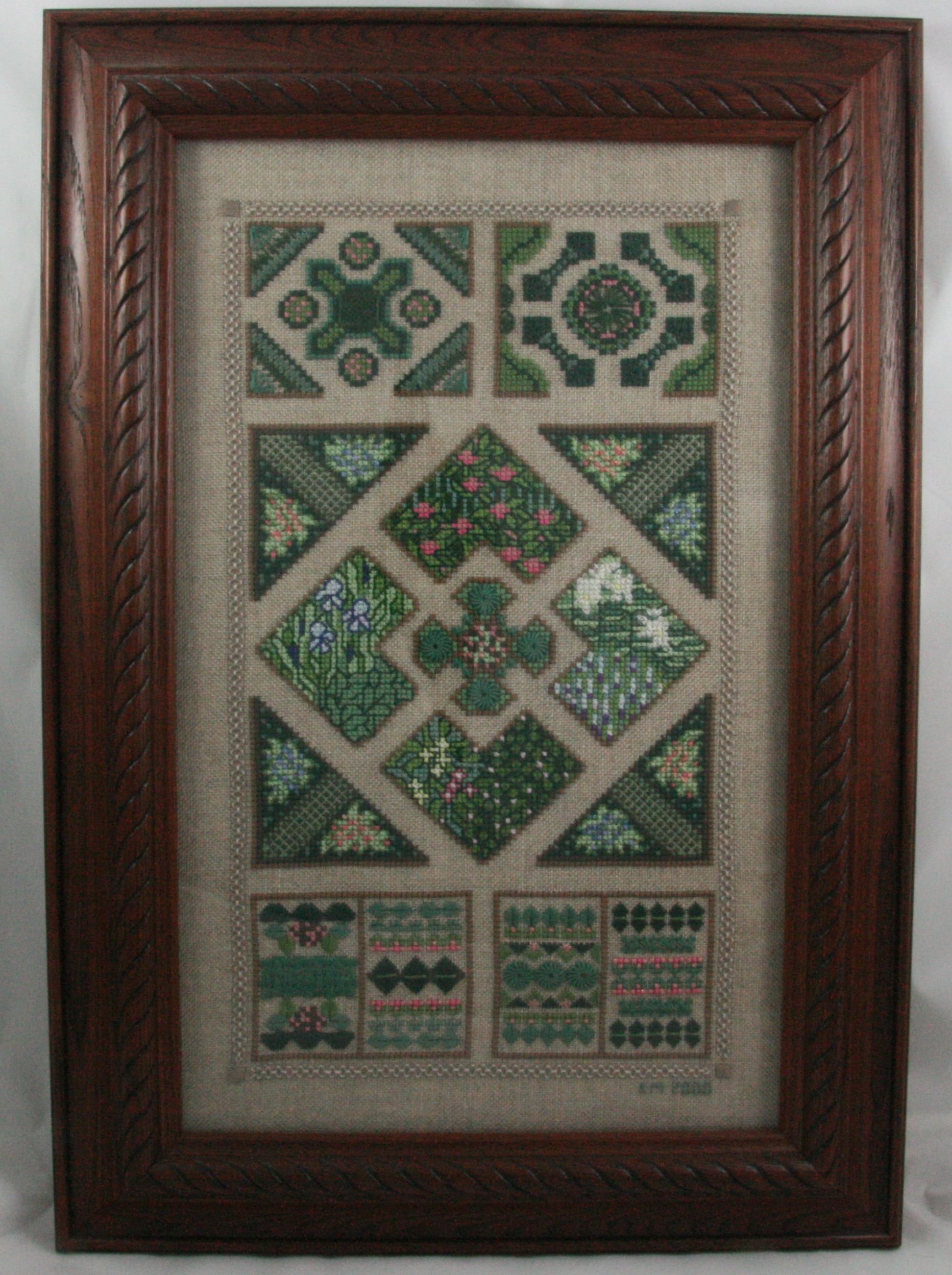 It’s nice to know really talented people! This needlework piece was designed and taught by a friend in my former EGA guild, Edie Feisner. It’s a hardanger adaptation of classic quilt designs. Edie is an expert in color, having published several books and taught at the university level for many years. Sorry for the poor photography on this one — I got a reflection no matter what I tried.